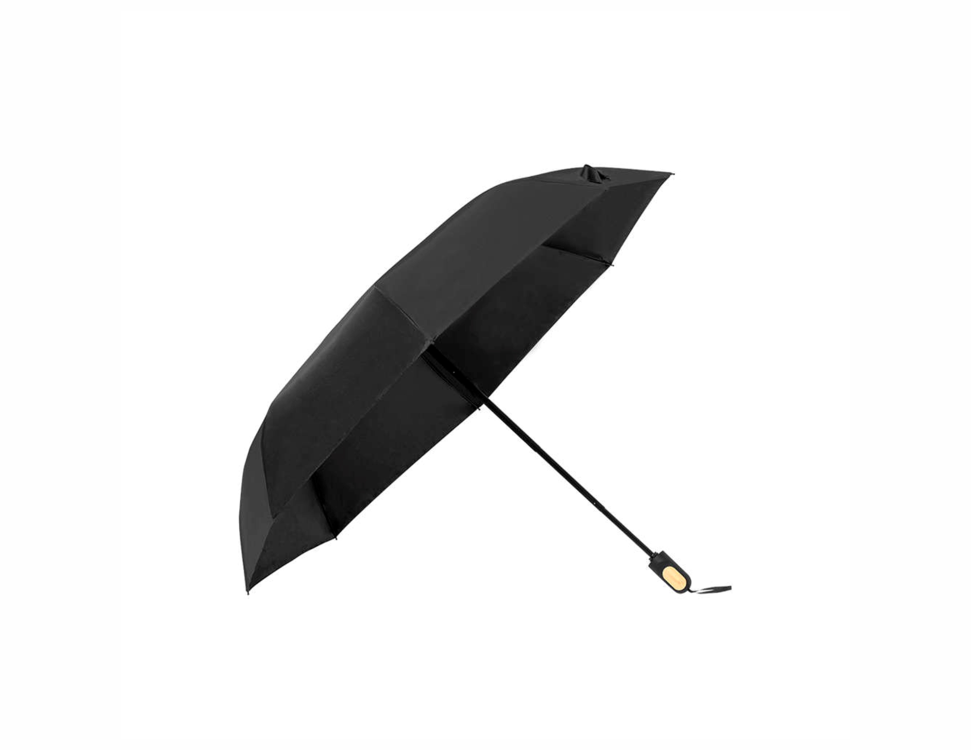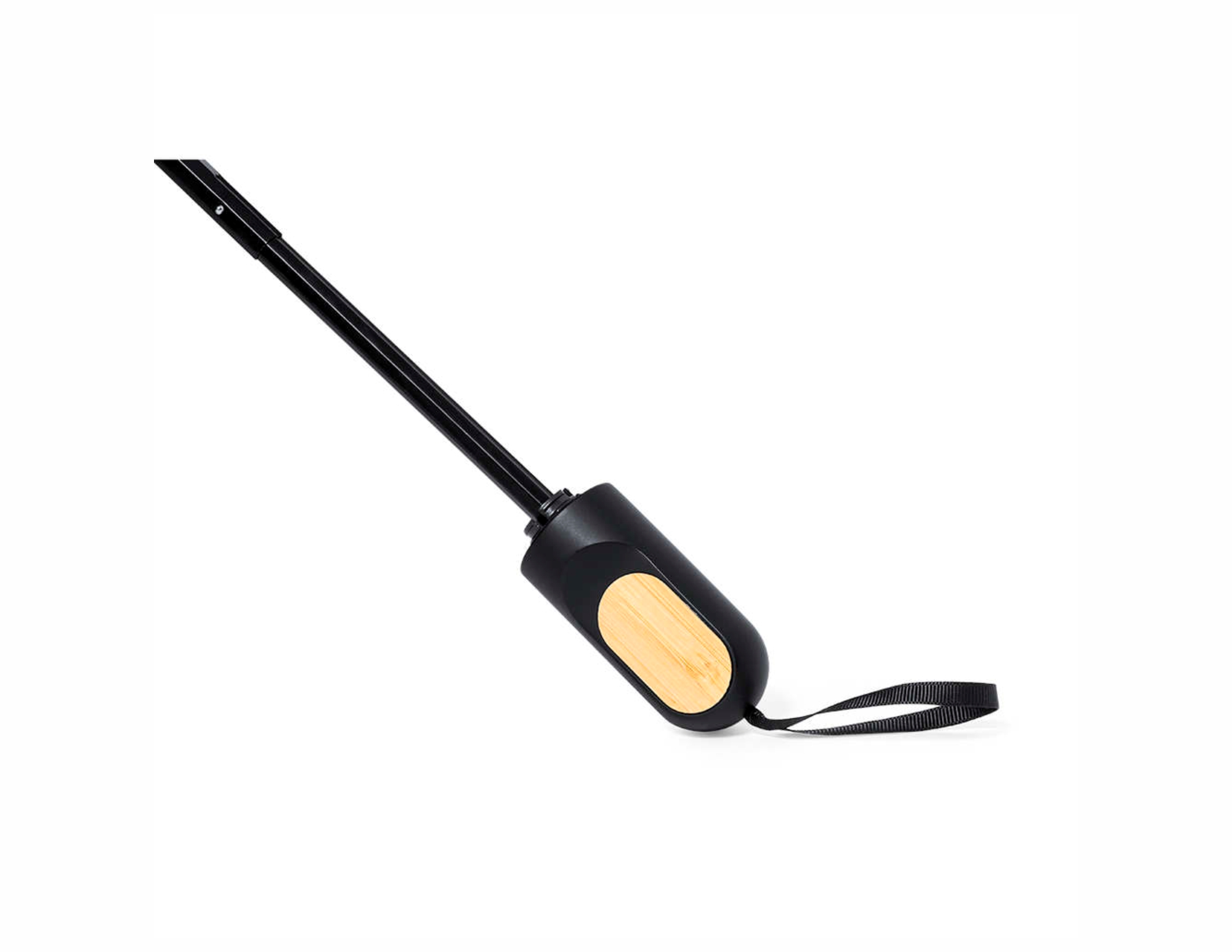 Paraguas plegable de 97cm de diámetro. En material pongee 190T RPET. De apertura manual, con sistema anti viento y varillas fabricadas en fibra de vidrio. Mango ergonómico con elegante detalle en bambú, fácil transporte gracias a su cordón, funda y cierre con velcro a juego. Con etiqueta distintiva RPET. Presentado en bolsa individual reciclada.