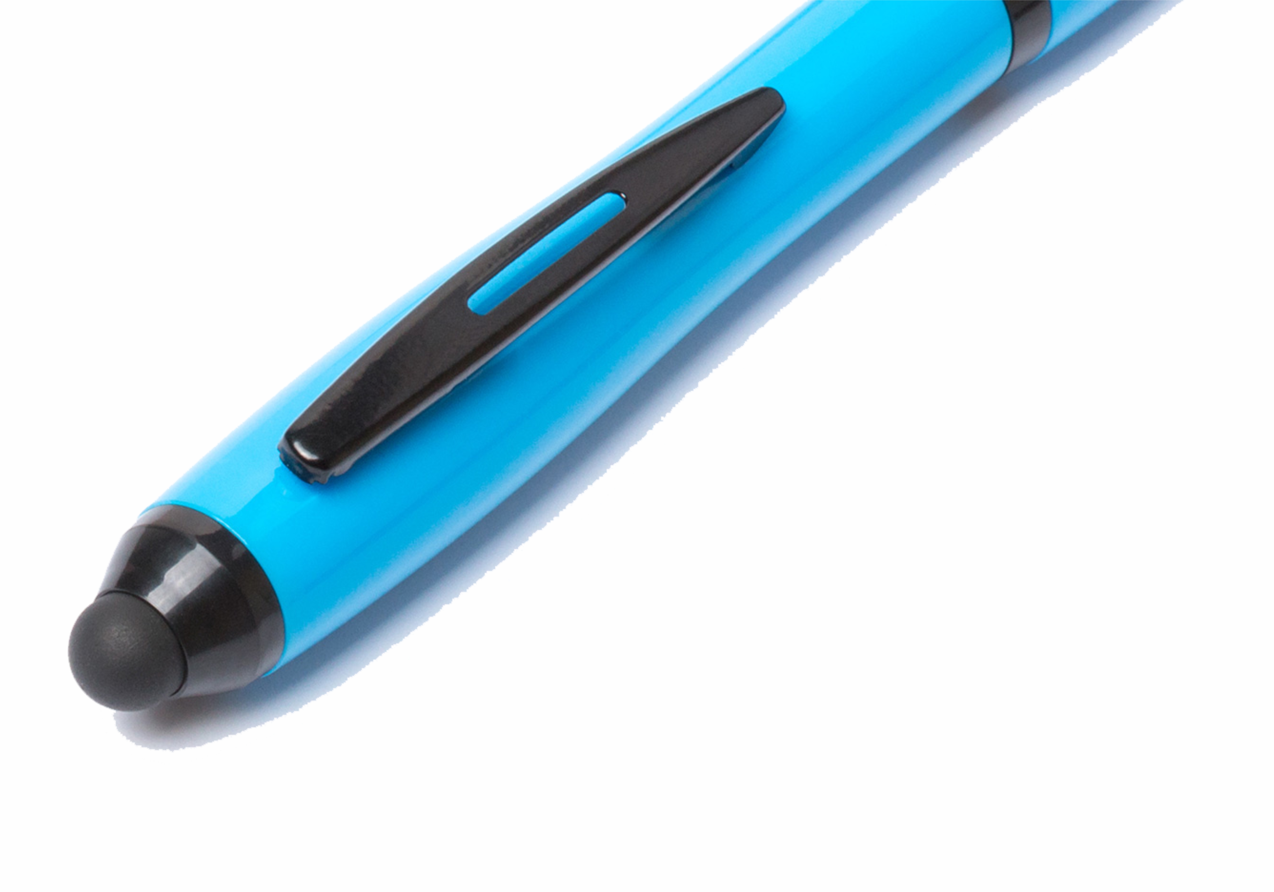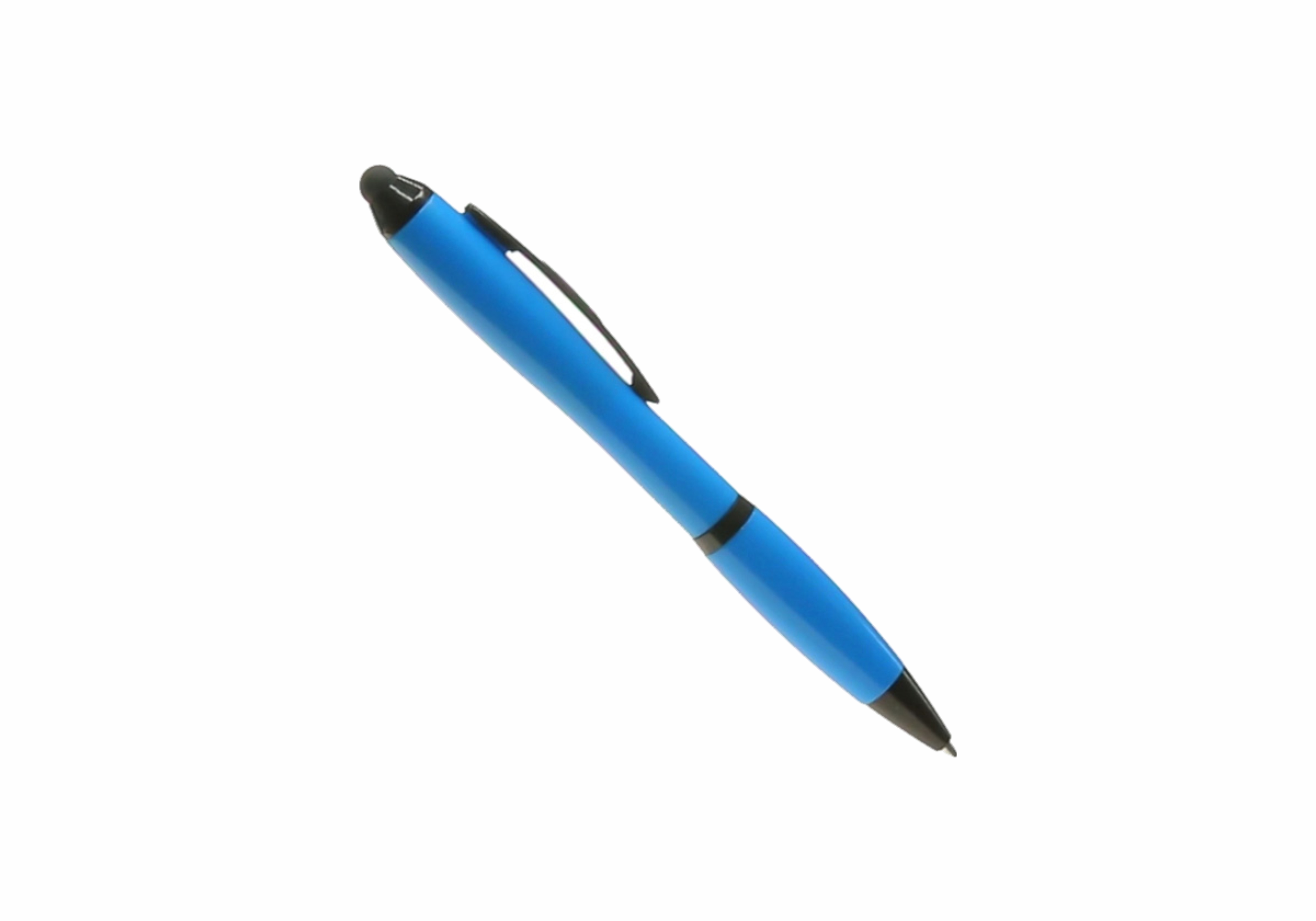 Bolígrafo puntero de mecanismo giratorio de atrevido diseño bicolor con accesorios en negro y cuerpo de suave acabado en divertidos colores flúor. Con original clip metálico troquelado a juego y cómoda empuñadura. Tinta azul.